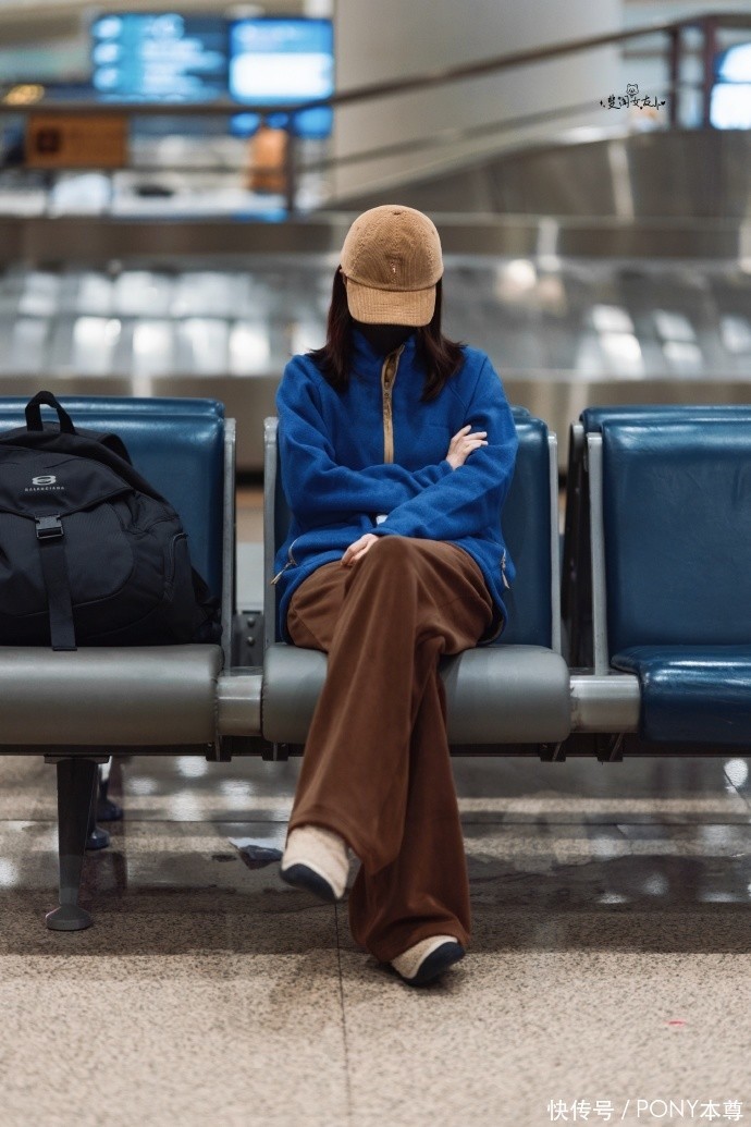 下半身搭配的棕色绒面阔腿裤,与上衣形成鲜明的色彩碰撞,克莱因蓝的明艳与棕色的沉稳相互平衡,既不会显得过于张扬,又能凸显个性,打破了秋冬穿搭的沉闷感。