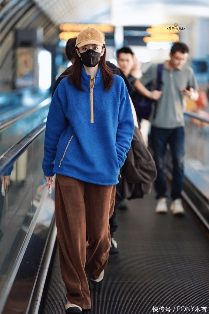 如果说第一套造型是清爽少年感,那这套克莱因蓝色立领上衣 + 棕色绒面阔腿裤的搭配,就尽显张小斐的御姐气质。克莱因蓝作为近年来的热门色彩,以其高饱和度的特性,自带吸睛属性,而张小斐选择的这款克莱因蓝色上衣,采用了亨利领设计,简约的领口既保留了优雅感,又增添了几分复古韵味,绒面材质则在秋冬季节显得格外温暖,触感柔软细腻,提升了整体造型的质感。